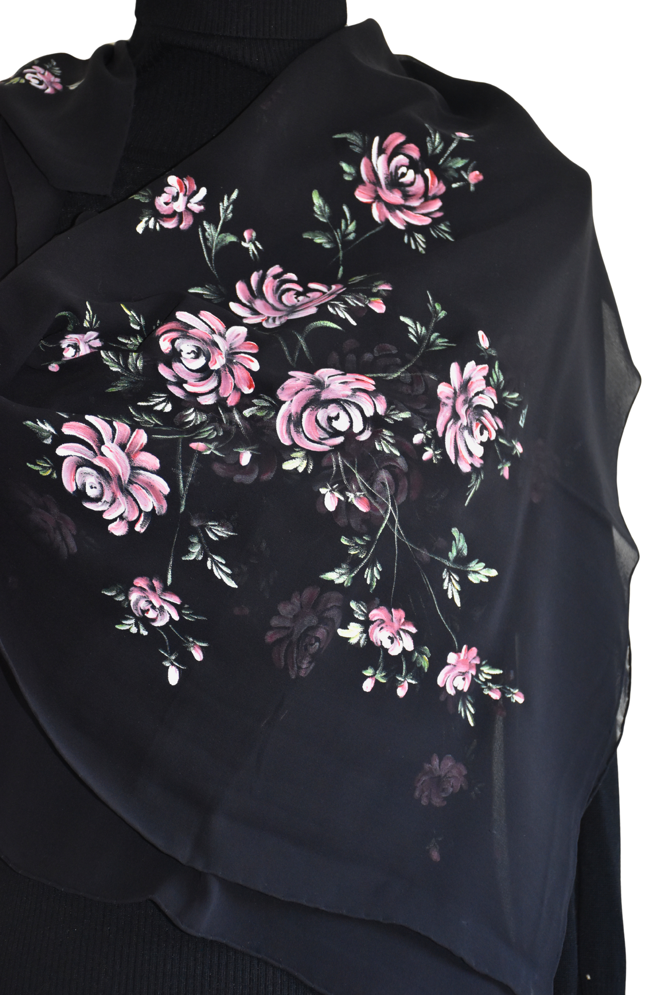 Si distingue per l’elegante fondo nero su cui prendono vita delicate rose color rosa e malva, illuminate da morbide sfumature e sottili rami verdi.